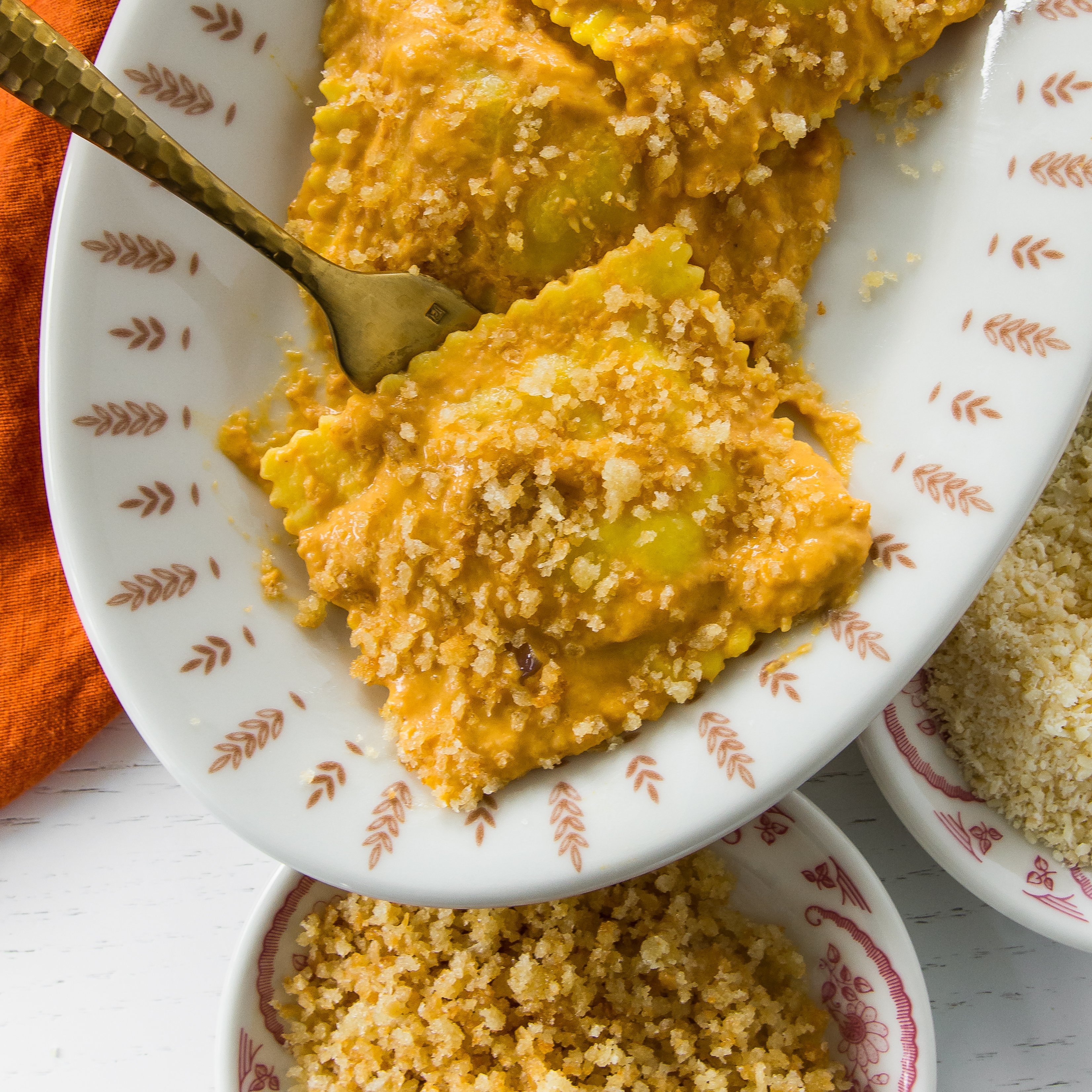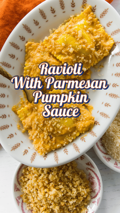 Author note: This recipe makes a good amount of Parmesan Pumpkin Sauce. If you are feeding a crowd (around 8 people), be sure to use two packages of cheese ravioli. If serving around four, use one package of ravioli and expect sauce leftovers. If you like heat, add 1/4 teaspoon (or more!) red pepper flakes to the sauce while it’s simmering. Toasted hazelnuts or pine nuts are excellent toppers for this recipe.
