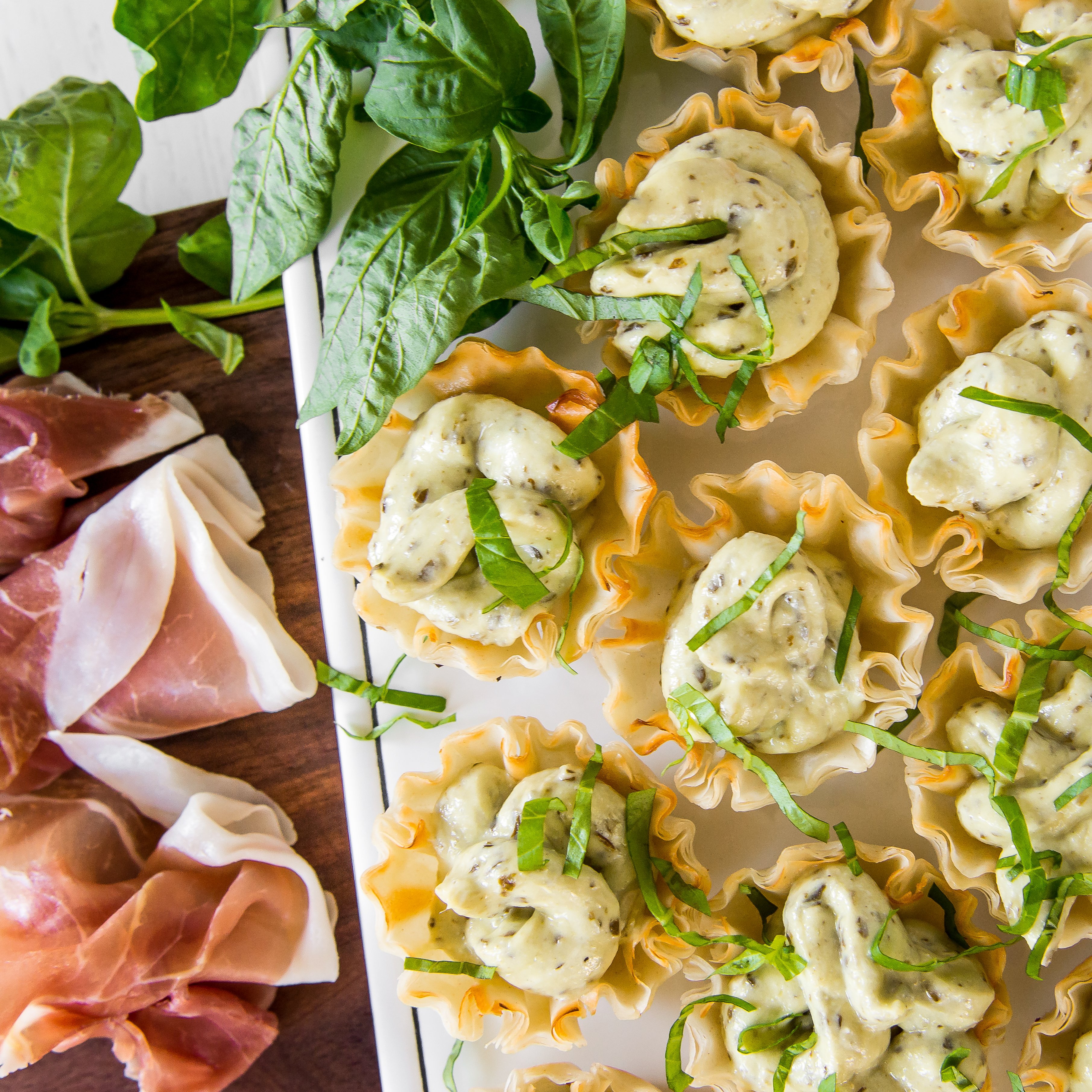 Place the pesto mascarpone into the corner of a sealable plastic bag. Slice the tip of the corner, and pipe the pesto mascarpone into the canapes.