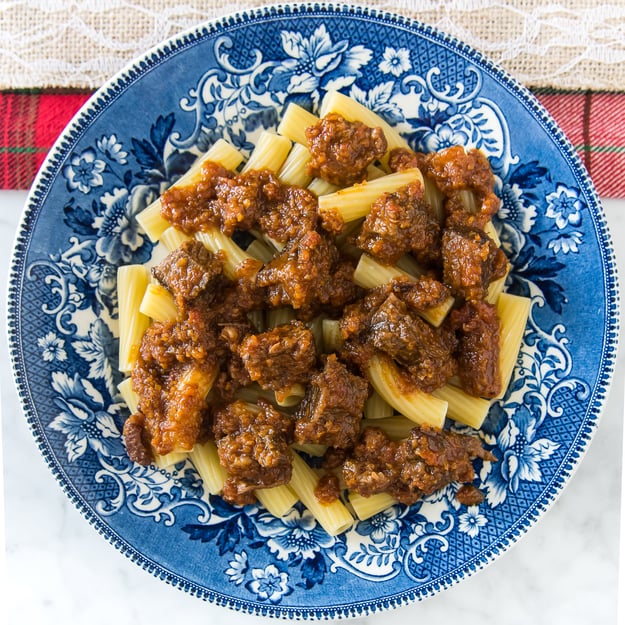 Author note: Short ribs, while tender and delicious, are incredibly fatty. Expect to remove a generous amount of fat throughout the cooking process. If this step is skipped, the ragu will be overwhelmed with short rib fat and it will significantly affect the outcome. If the sauce looks dry after combining the shredded meat and sauce, add additional water and warm through. This recipe can be made up to three days in advance.